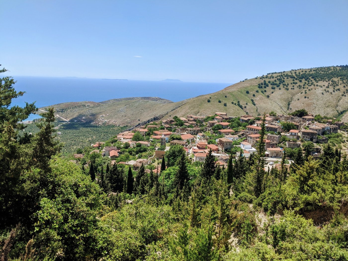 Nach einer malerischen Fahrt entlang der glitzernden Buchten des Ionischen Meeres starten wir unsere Wanderung im Dorf Kudhes. Der Weg führt uns durch Olivenhaine und über die kurvige Dorfstraße bis ins Herz des Ortes. Unter dem Schatten der alten Platane machen wir eine Pause und kommen mit den Einheimischen ins Gespräch. Der Pfad steigt sanft an, gesäumt von Oleander und Zypressen. Ziegenherden grasen neugierig am Wegesrand. Nach einem kurzen Anstieg öffnet sich der Blick: das tiefblaue Meer liegt vor uns, und am Horizont ist Korfu zu sehen. Bald erreichen wir die Altstadt von Qeparo – ein Ort, in dem die Zeit stillzustehen scheint. Zwischen Steinhäusern und Kopfsteinpflaster genießen wir ein leichtes Mittagessen in einer Taverne.