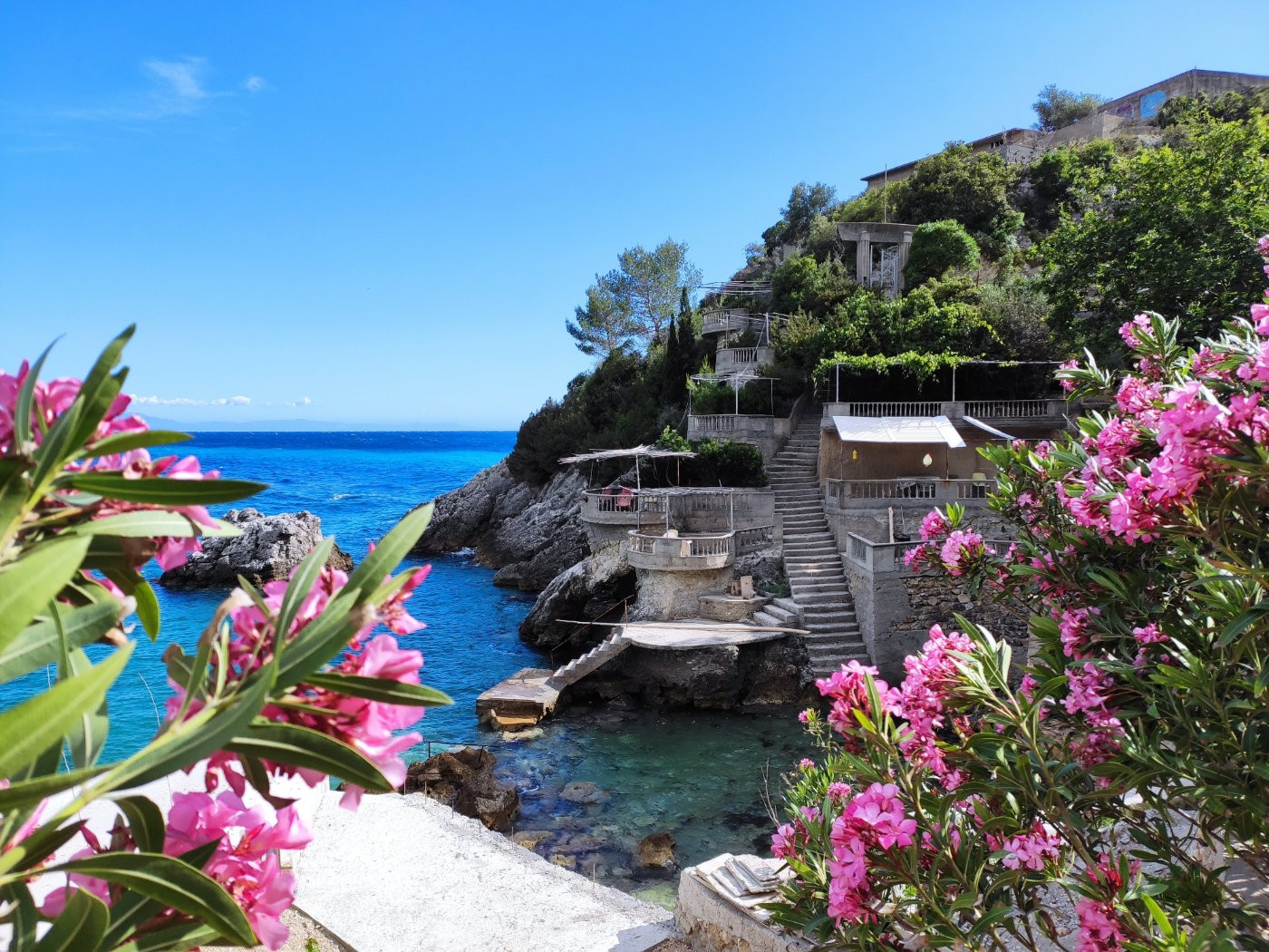 Eine schmale Bergstraße bringt uns hinauf zum "Balkon der Riviera“. Das Dorf Pilur liegt stolz auf einem Hochplateau, 700 Meter über dem Meer. Vom Partisanendenkmal neben dem Dorfcafé folgen wir dem alten Karawanenweg bergab Richtung Küste. Der Eingang zur Schlucht duftet nach Oregano und wilder Minze – doch laut Legende soll hier der Teufel hausen, also verweilen wir nicht zu lange. Alte Kiefern verleihen dem oberen Abschnitt ein alpines Flair, bevor die Vegetation mediterraner wird. Schließlich erreichen wir einen Olivenhain mit hohen Farnen – hier verstecken sich noch alte Bunker aus kommunistischer Zeit. Ein Feldweg führt uns in die Altstadt von Himare, die auf einem Felsvorsprung 250 Meter über den Buchten thront. Wir schlendern durch mittelalterliche Gassen, entdecken die Überreste der Zyklopenmauer und genießen den weiten Blick über die Riviera. Von dort steigen wir über den alten Eselspfad hinab zum Meer. Der Weg führt weiter entlang der Küste, durch mediterrane Macchia zu versteckten Buchten mit glasklarem Wasser – ein traumhafter Abschluss für diesen Wandertag.