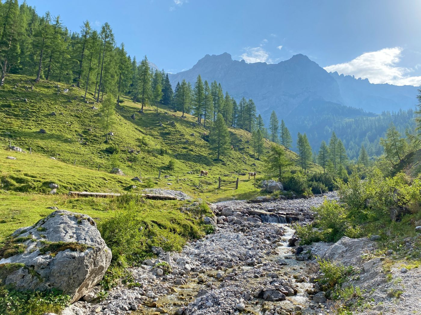 Der Tag beginnt mit einer einzigartigen Morgenstimmung in den Bergen. Die Route führt entlang des Gosaukammes über saftige Almen bis zur Stuhlalm – ideal für eine Rast und Verkostung regionaler Almprodukte. Unterhalb des Donnerkogels (mit optionaler Gipfelbesteigung) erreichst du die Gablonzerhütte mit spektakulärem Blick auf Dachsteingletscher, Gosau und den glitzernden Gosausee. Von dort Seilbahnfahrt ins Tal.