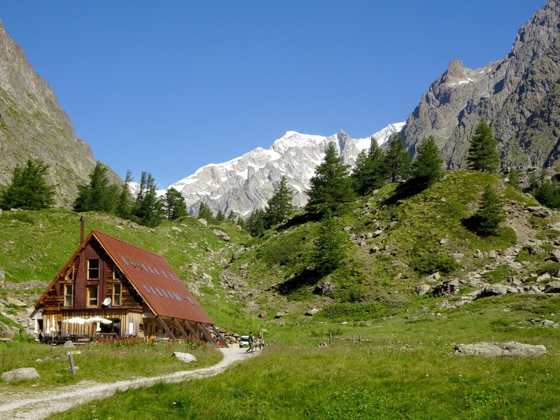 Vorbei am Rifugio Bertone geht es auf einem aussichtsreichen Höhenweg die Bergflanken entlang. Die Schutzhütte Rifugio Bonatti empfängt dich zur Rast auf der Terrasse, direkt gegenüber des Mont-Blanc Massivs. Weiter über Brücken und Bäche führt der Weg nach Arnouva, auf 1.800m Höhe im  Talschluss des idyllischen Val Ferrets gelegen. Mit dem Bus geht es zurück nach Courmayeur.