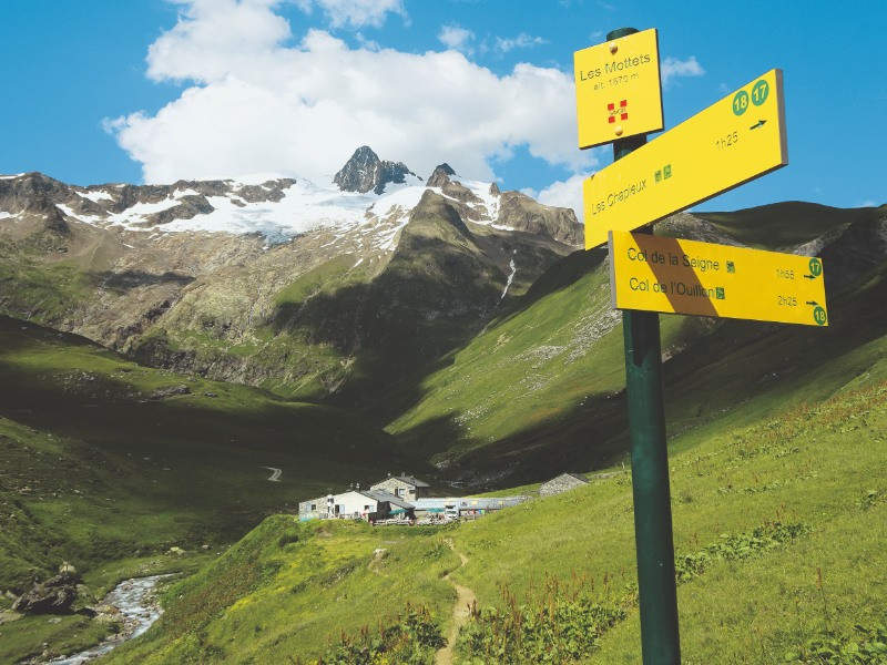Vom Col du Bonhomme (2329 m) führt der Weg über einen felsigen Grat hinauf zum Col de la Croix du Bonhomme (2450 m). Im Refuge de la Croix du Bonhomme, einer traditionellen Schutzhütte des französischen Alpenvereins, kannst du dich stärken. Der letzte Abstieg über Almwiesen, die von klaren Bergbächen durchzogen sind, bringt dich ins Vallée des Glaciers (Tal der Gletscher).