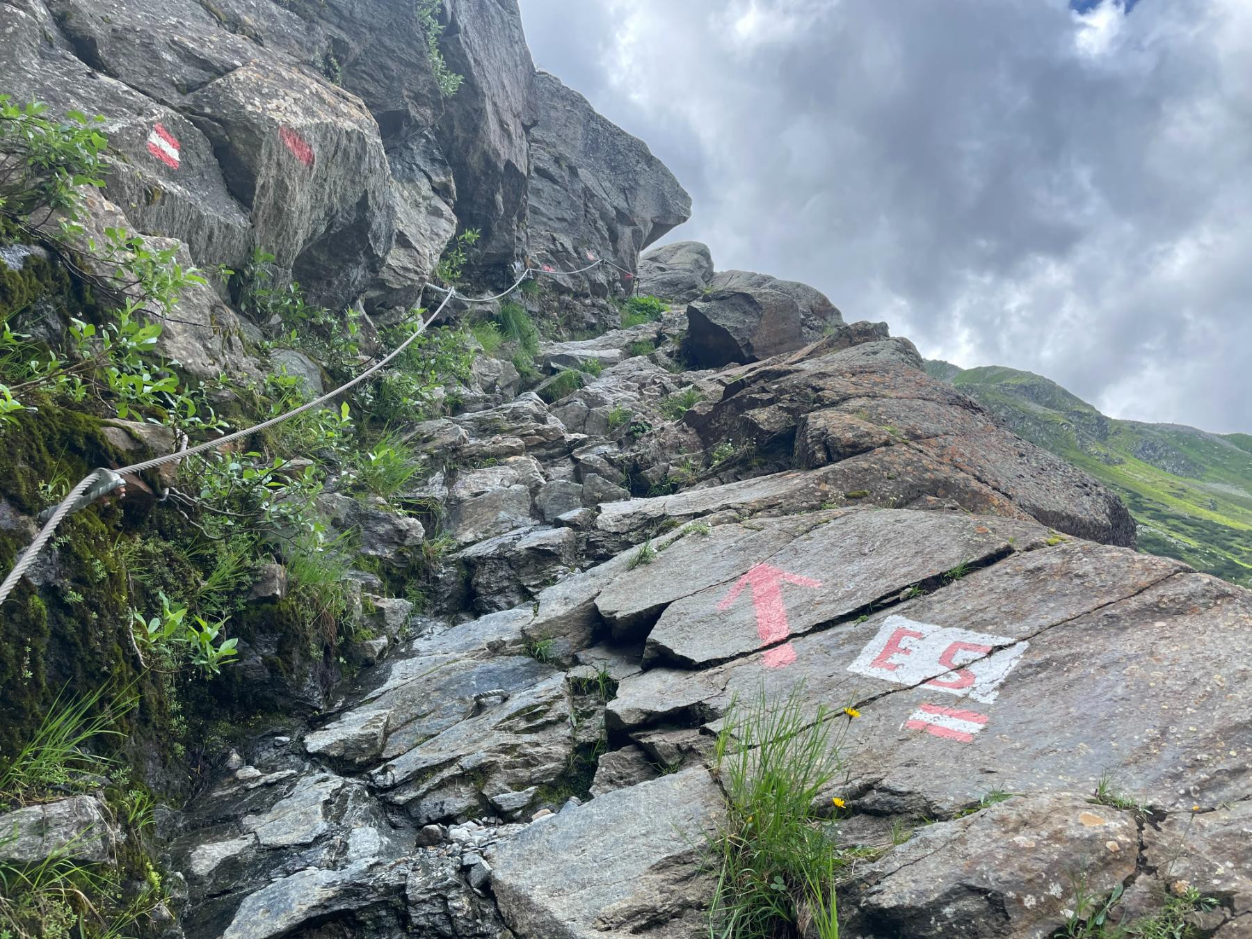 Die Alpenüberquerung auf dem E5 von Hütte zu Hütte von Oberstdorf nach Meran erfordert Kondition für Gehzeiten von 8 bis 9 Stunden pro Tag. Du musst Aufstiege bis 1.300 Höhenmeter, Abstiege bis 2.000 Höhenmeter sowie Gehstrecken bis 20 km bewältigen. Die Route führt teils durch alpines Gelände mit Schneefeldern oder rutschigem Geröll. Kurze Stellen sind mit Drahtseilen versichert. Deshalb solltest du Bergwandererfahrung haben. Trittsicherheit und Schwindelfreiheit sind notwendig.