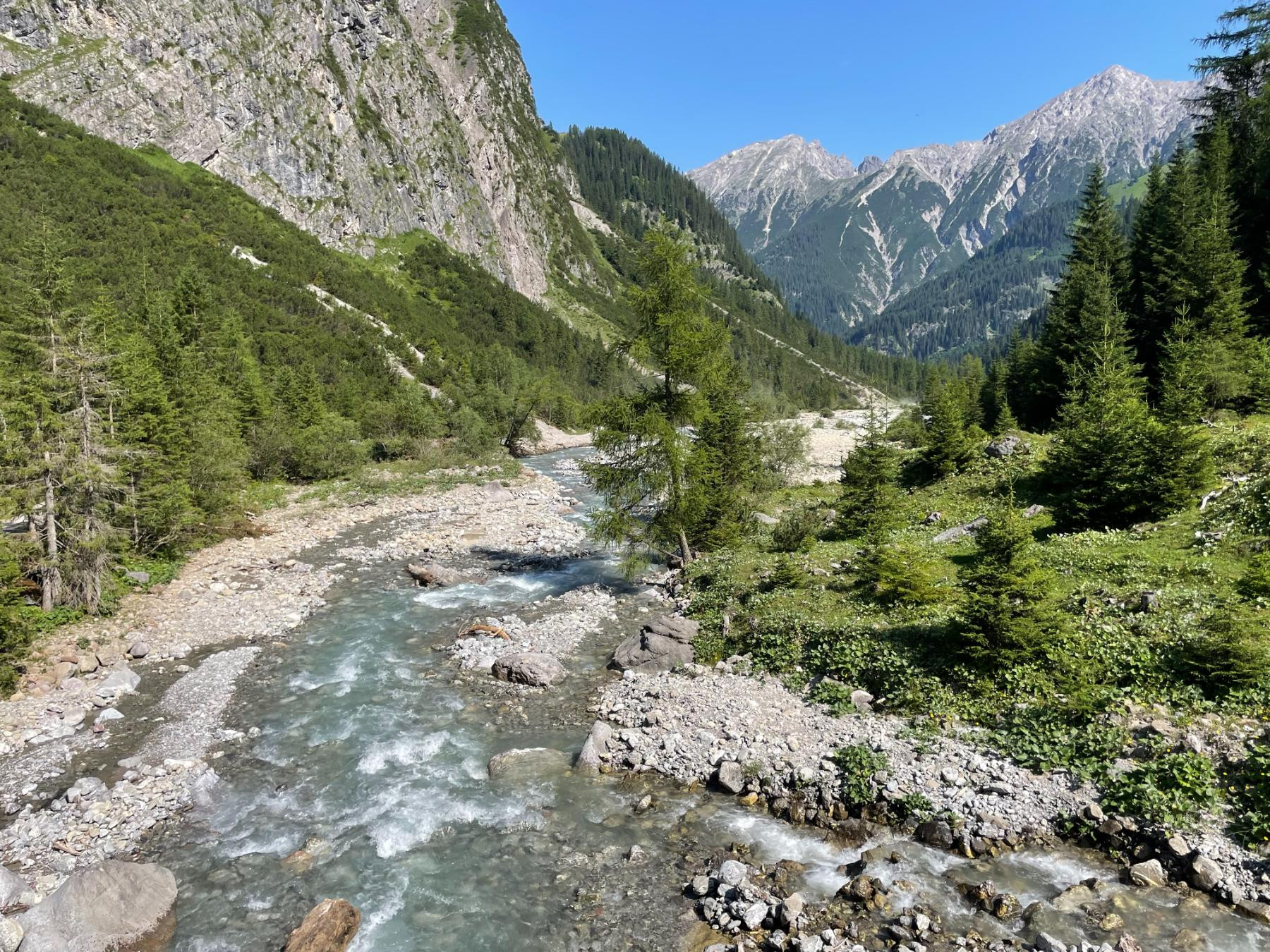 Am Bahnhof in Oberstdorf treffen wir unseren Bergwanderführer für unsere Alpenüberquerung. Nach einem kurzen Ausrüstungscheck fahren wir mit dem Bus in die Spielmannsau, wo der Aufstieg zur Kemptner Hütte beginnt. Der abwechslungsreiche Weg durch den engen Sperrbachtobel hinauf zur aussichtsreich gelegenen Hütte führt uns gleich hinein in die großartige Bergwelt der Allgäuer Alpen.