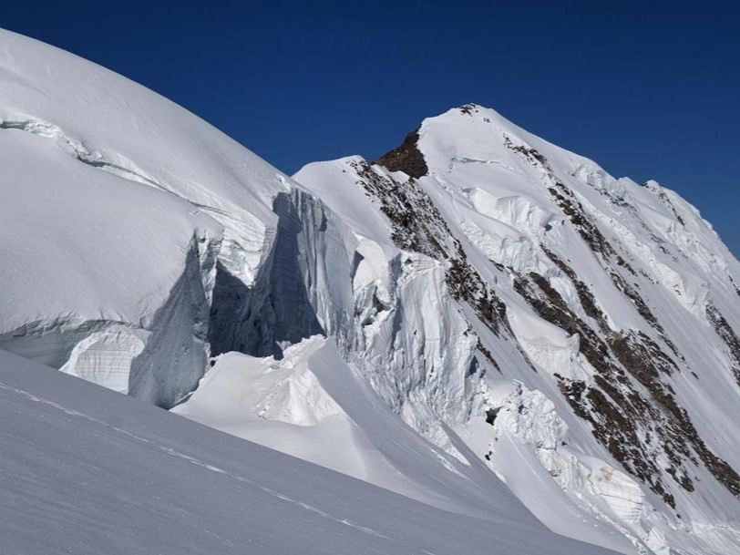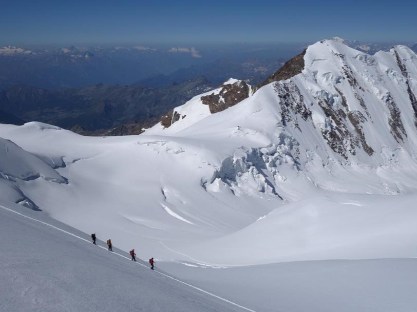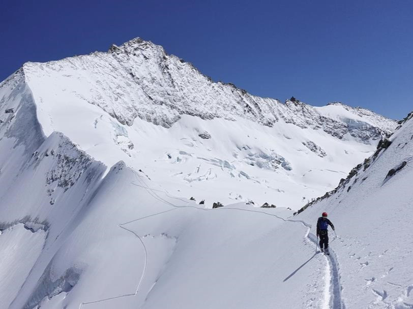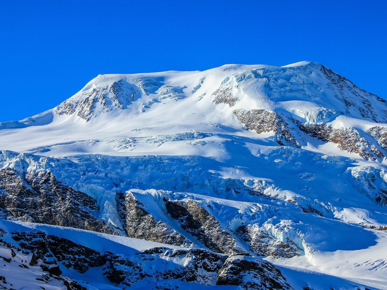 Im Herzen des Monte-Rosa-Massiv steht ein ganzer Reigen an Viertausendern dicht an dicht. Die Pyramide Vincent und das Balmenhorn sind die beiden nächstgelegenen zu unserem Hüttenstützpunkt. Nach der langen Tour des Vortages ist der Tag heute etwas weniger fordernd. Zur Vincentpyramide steigen wir über weite Schnee- und Firnhänge auf, zur großen Christusstatue auf dem Felsgipfel des Balmenhorn führt eine kurze versicherte Kletterpassage. Zurück geht es wieder zur Gnifettihütte.