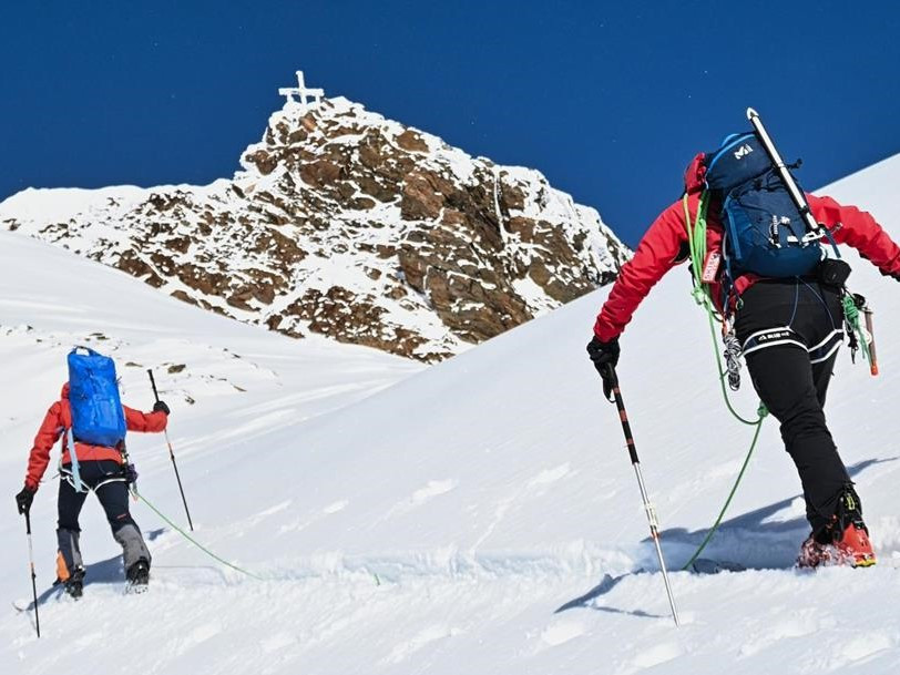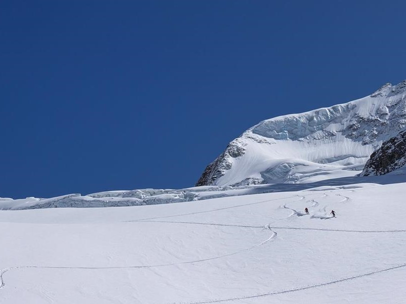 Ein kurzer Transfer bringt uns am Morgen nach Zermatt, mit der Seilbahn geht es weiter bis auf 3.820 m – der Bergstation auf dem Klein Matterhorn. Von hier starten wir den kurzen Aufstieg zu unserem ersten Viertausender, dem 4.163 m hohen Breithorn. Vom Gipfel fahren wir wieder ab und queren ins Schwarztor, wo die Abfahrt über den wild zerrissenen Schwärzegletscher hinunter zum Gornergletscher startet. Nach diesem einmaligen Abfahrtserlebnis wartet auf uns noch der Anstieg zu unserem Etappenziel, der Monte-Rosa-Hütte.