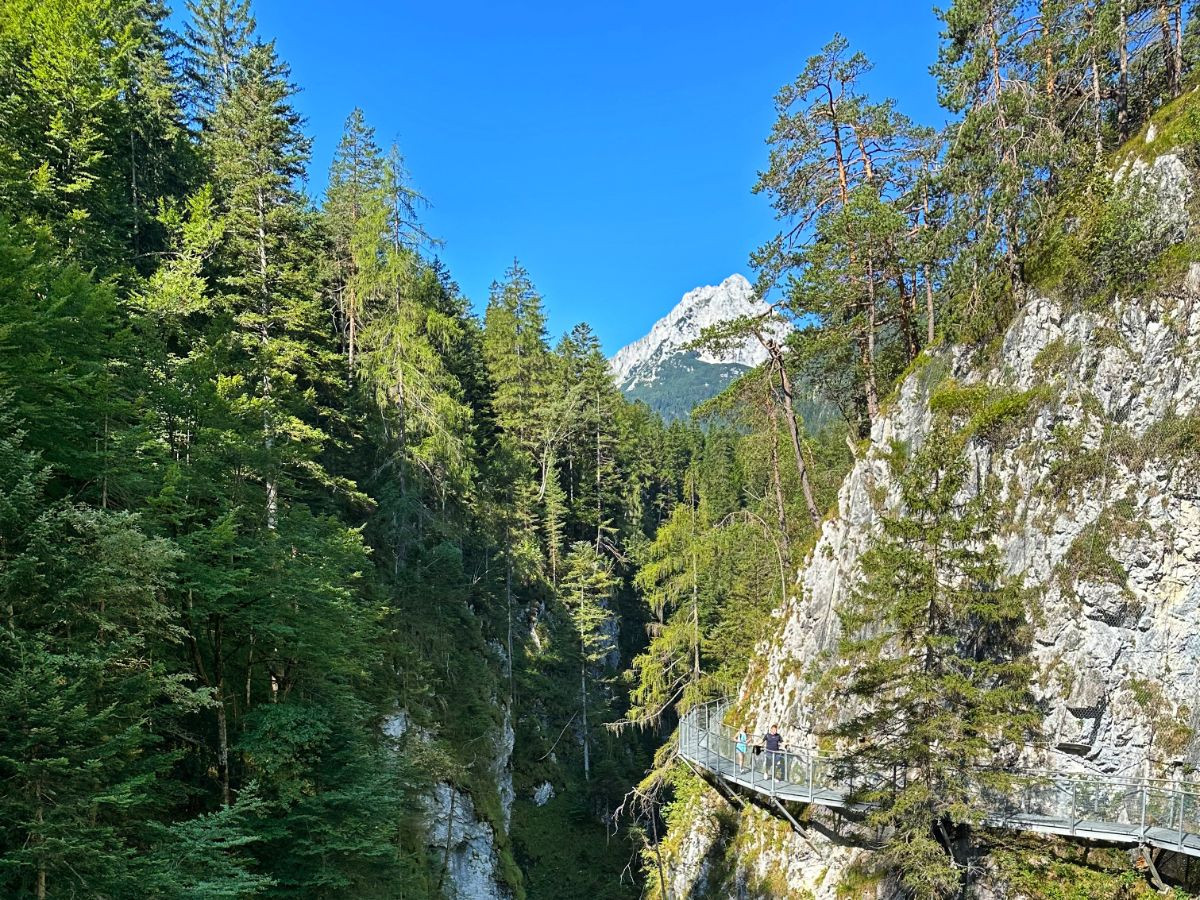 Heute überquerst du die Grenze – Bayern liegt hinter dir, Tirol erwartet dich! Nervenkitzel gibt's in der spektakulären Geisterklamm: Über schmale Stege und Brücken schwebst du hoch über der Schlucht – der Blick in die Tiefe ist nichts für schwache Nerven. Danach entspannst du bei der Wanderung durchs idyllische Hochtal bis ins wunderschöne Leutasch, eingerahmt von mächtigen Gebirgsketten.