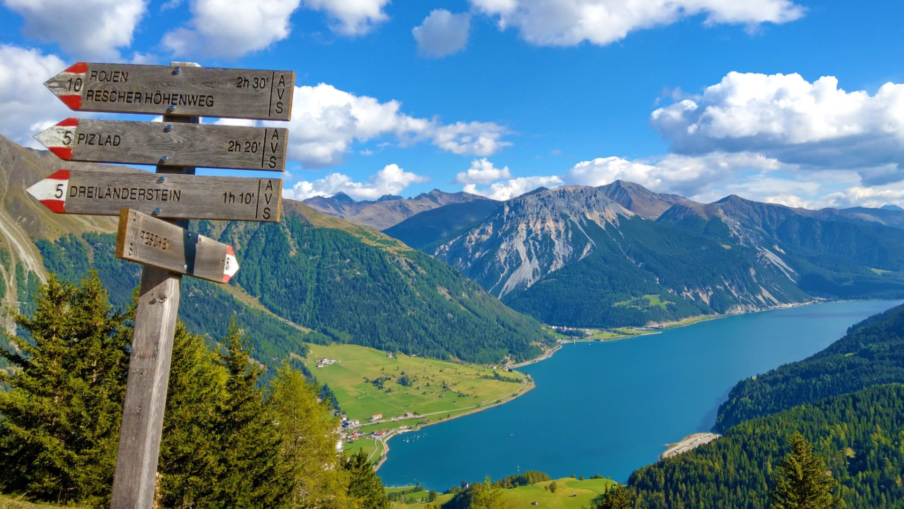 Heute beginnt das Dreiländereck-Abenteuer! Zuerst bringt dich ein Transfer zum Reschenpass, von dort schwebst du per Seilbahn zum Mutzkopf. Deine Wanderung führt zu Schwarzsee und Grünsee, dann steigst du hinauf bis zum berühmten Dreiländergrenzstein. Genau hier triffst du auf den Schnittpunkt von Italien, Österreich und der Schweiz – ein einmaliges Gefühl! Über saftige Almen geht's hinunter zum imposanten Reschensee mit seinem berühmten, aus dem Wasser ragenden Kirchturm. Willkommen in Italien.