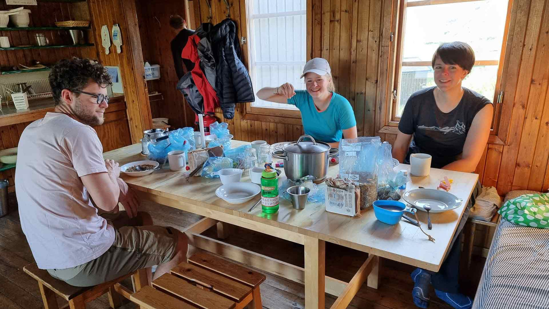 Wir überqueren heute Schwedens zweithöchsten Pass auf etwa 1.100 Höhenmetern. Der Anstieg ist sanft und schnell erreichen wir die kleine Schutzhütte auf dem Pass, in der wir rasten können. Der Abstieg ist etwas steiler als der Anstieg und erfordert etwas Konzentration. Umrahmt von Felswänden rechts und links laufen wir hinab zu Sälkastugan, in der die Saunaliebhaber wieder auf ihre Kosten kommen.