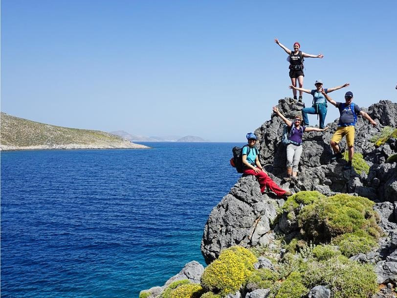 Wir trekken entlang unberührter und menschenleerer Abschnitte und vielfach entlang wilder, ursprünglicher Steilküsten. Unter uns funkelt das türkisblauen Meer. Alles das ist gewürzt durch kurze, einfache Kletterstellen im Aufstieg und Abseilen über teils gewaltige Höhlenüberhänge. Ein steter Begleiter dabei ist die griechische Sonne, als Gegenpol dazu sorgt der allgegenwärtige, trockene Wind für angenehme Trekkingtemperaturen. Die traumhaften kleinen Buchten, an denen man unweigerlich vorbeikommt, sind willkommende Abwechslung, zum Baden und Faulenzen.