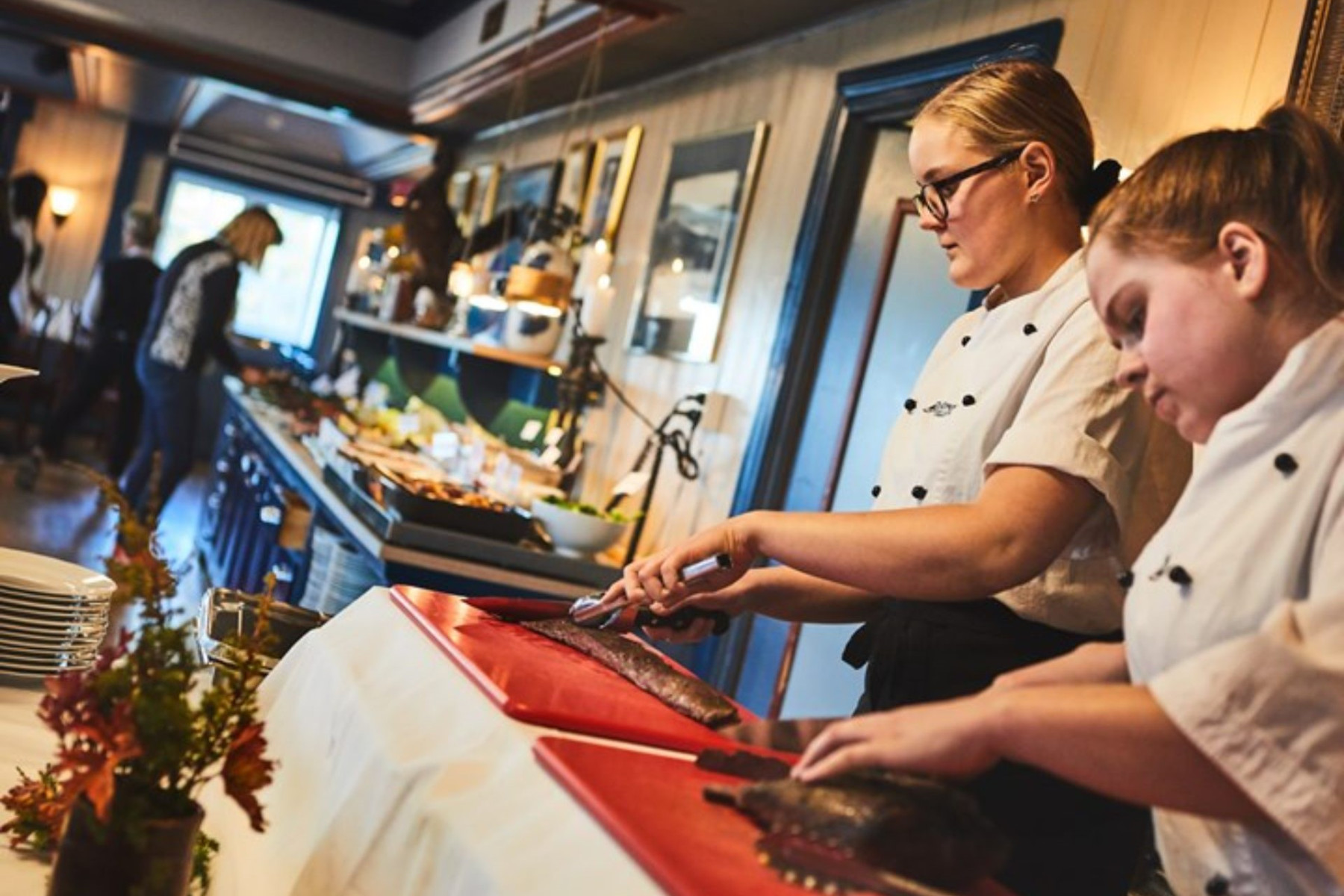 Im Preis inbegriffen sind Frühstück, ein Lunchpaket und Abendessen. Das Lunchpaket kannst du dir beim Frühstücksbuffet selbst zusammenstellen, und heiße Getränke wie Tee kannst du in eine Thermosflasche auffüllen. Das Abendessen wird als 3-Gänge-Menü serviert. Die Köche verwenden Zutaten von lokalen Bauern, um traditionelle norwegische Gerichte modern zuzubereiten — nach einem aktiven Tag garantiert ein weiteres Highlight deines Aufenthalts.