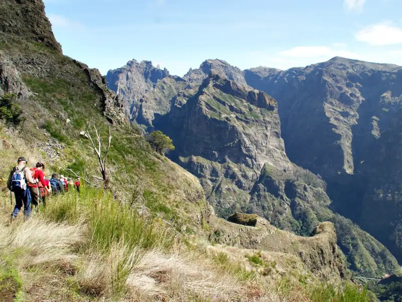 Der "große Gipfel" ist der sprichwörtliche Höhepunkt unserer heutigen Bergtour. Schon zu Beginn dieser Etappe genießen wir einen überwältigenden Ausblick ins Tal von Serra de Agua. Auf einem aussichtsreichen alten Pilgerweg wandern wir hinauf zum Sattel Boca do Cerro. Die Gebirgsblumen sind eine Augenweide - leuchtend gelber Ginster und tiefblaue Natternköpfe säumen unseren Weg. Nach einer gemütlichen Rast am Sattel, steigen wir über einige ausgesetzte Felstreppen steil zum markanten Gipfel des Pico Grande (1.657 m) auf. Wer den Aufstieg zum Gipfel auslassen möchte, kann am Sattel auf die Gruppe warten (ca. 2 Std.). Als Abschluss dieser großartigen Tour steht uns ein langer und anspruchsvoller Abstieg durch Kastanienwälder ins tief eingeschnittene Nonnental bevor. Herrliche Ausblicke machen die Mühe dieses Streckenabschnitts wett, und nicht nur das - am Ende der Wanderung wartet in einem urigen Restaurant ein frühes Abendessen auf uns - mit Espetadas, typisch madeirischen Fleischspießen. Wer an diesem Tag die Wanderung auslassen möchte, wird nicht mit der Gruppe am Espetada-Essen teilnehmen, sondern in einem Restaurant in São Vicente essen.