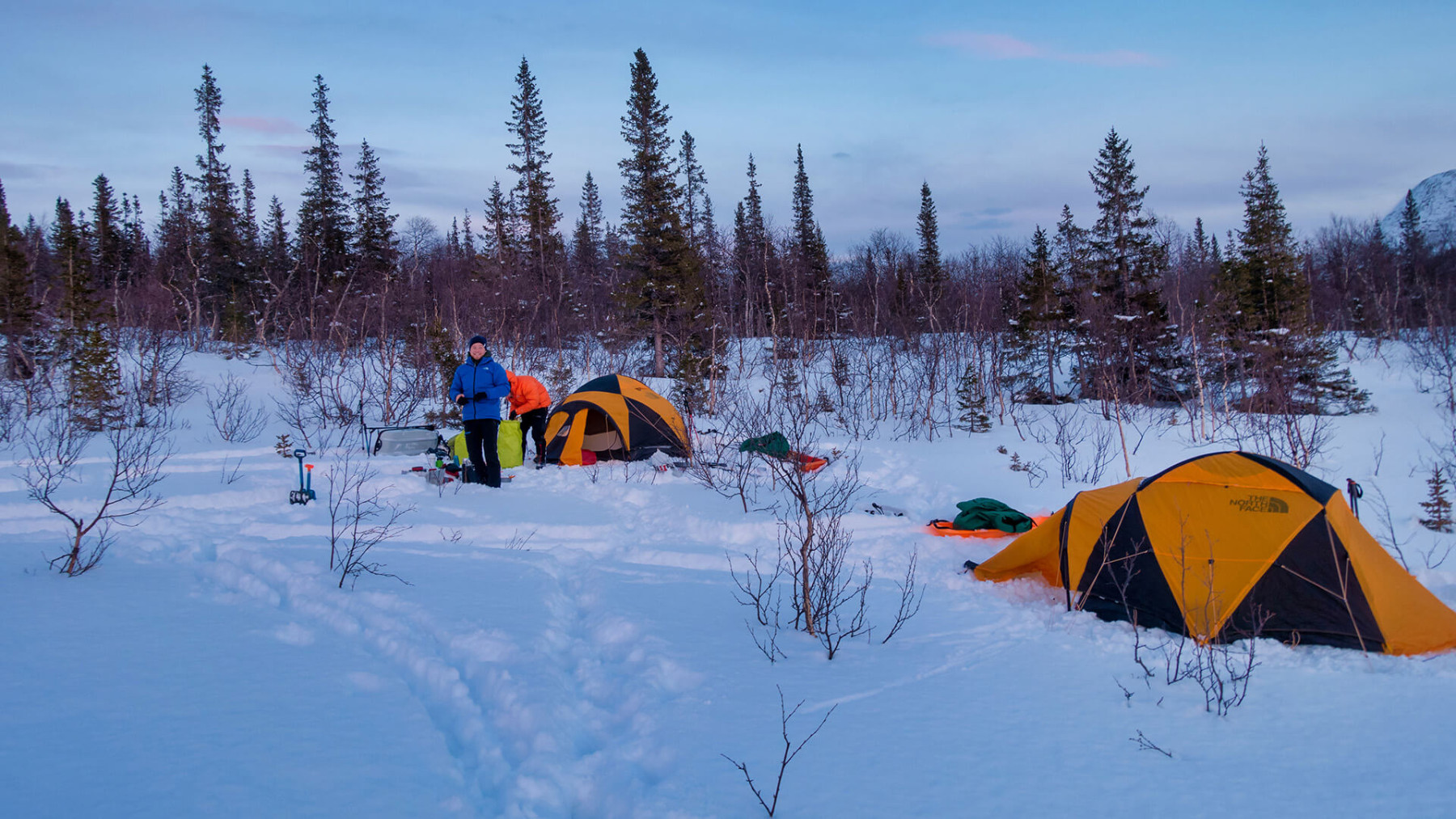Wir gehen durch die dichten Urwälder und steigen auf ins Hochfjäll, oberhalb der Baumgrenze. Wir durchqueren mehrere Hochebenen, laufen über zugefrorene Seen und Flüsse und wenn das Wetter und die Schneebedingungen es erlauben, steigen wir auf einen Berggipfel. Von dem aus geniessen wir einen fantastischen Blick auf die umliegenden Bergtäler. Unsere Lagerplätze finden wir ebenfalls auf den Hochebenen, an windgeschützten Stellen. Wir stellen unsere Zelte auf und genießen die klare, reine Abendluft und natürlich unser Abendessen. In den klaren Nächten sind die Chancen, Nordlichter zu beobachten, sehr gut.